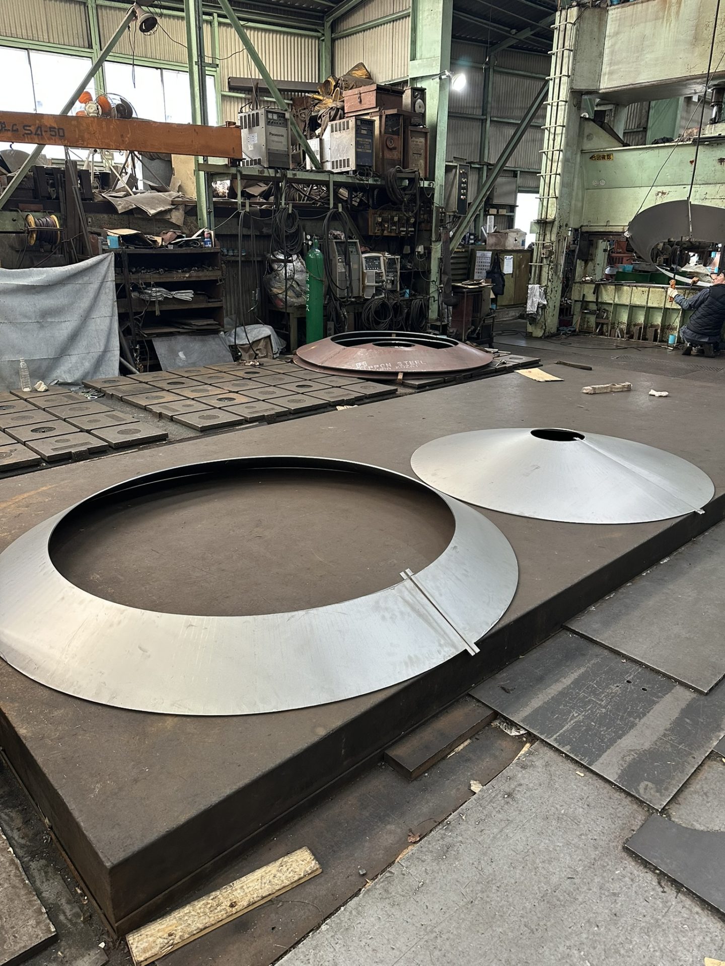 私たち森井鉄工所は、鉄板の折り曲げ加工を専門としています。 自社工場内には、大小様々なプレス機器を取り揃えており、長さ6500mmまでの加工や、条件が揃えば150mmの厚い鉄板を丸く曲げることもできます。 標準的なL字やコ字加工はもちろん、角丸管やテーパー管、異形管にも対応いたします。ロール業者や他ベンダー業者が不可能と判定した製品や加工も、ぜひ一度ご相談ください。